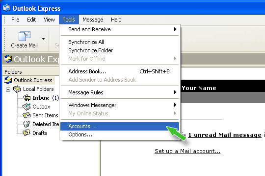1. In Outlook Express, from the Tools menu, select Accounts.