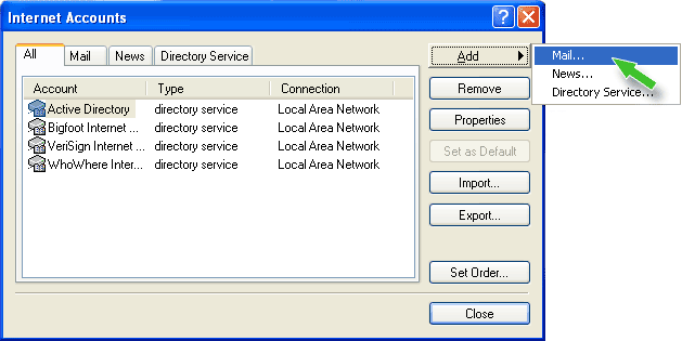 2. On the E-mail Accounts wizard window, click Add, and choose Mail