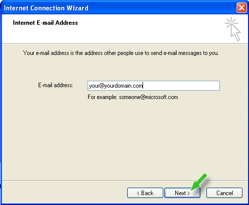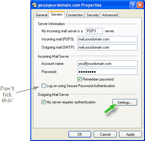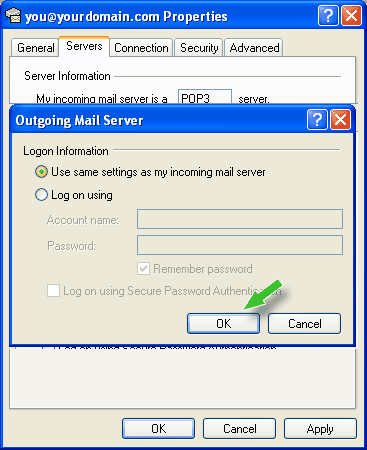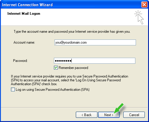 8. On The Internet Mail Logon screen, Type your full email address in the "Account Name" box, and in the "password" field type the password that you created for this email box in your control panel.