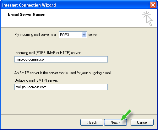 5. On the E-mail Server Names window, select POP3 as your Incoming e-mail server type.