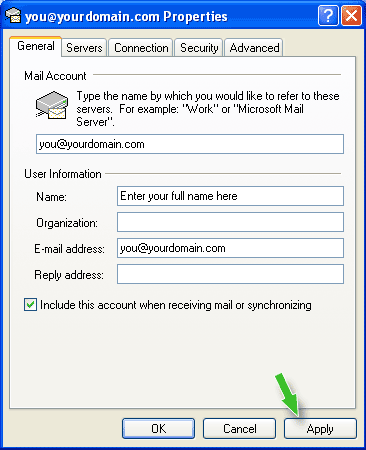 11. In the box under "Mail Account", Enter your full email address, and click Apply.